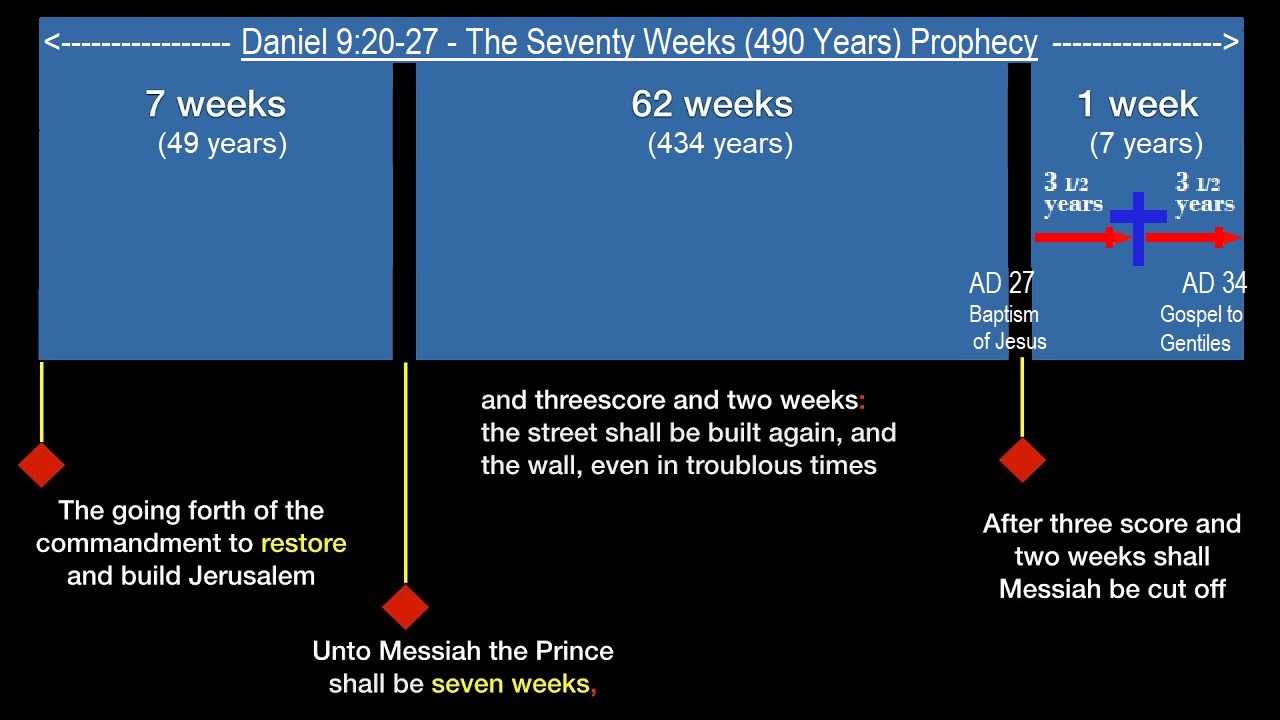 As stipulated in the prophecy, from the going forth of the command to restore and build Jerusalem until Messiah the Prince there would be seven weeks and sixty two weeks, for a total of 69 weeks or 483 years.