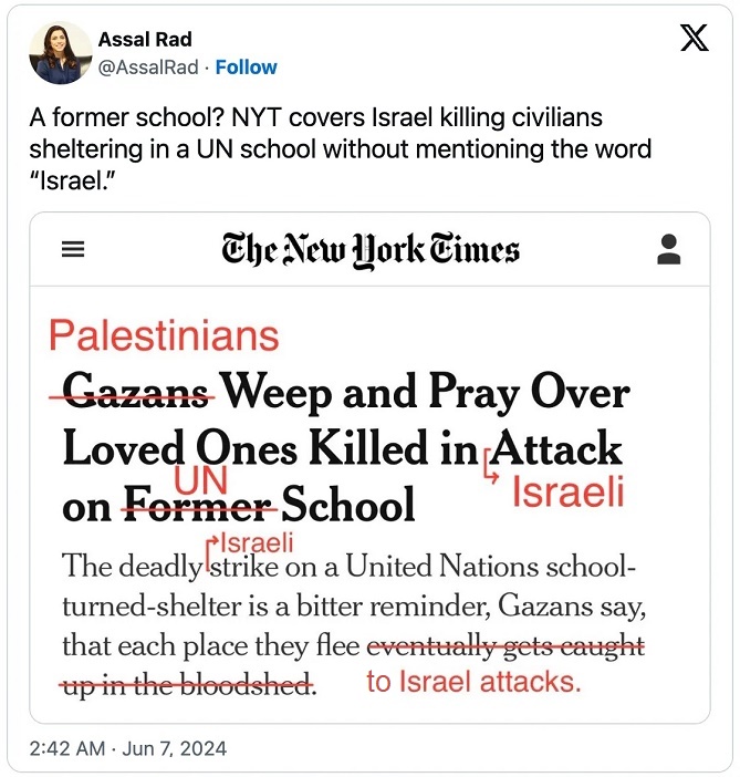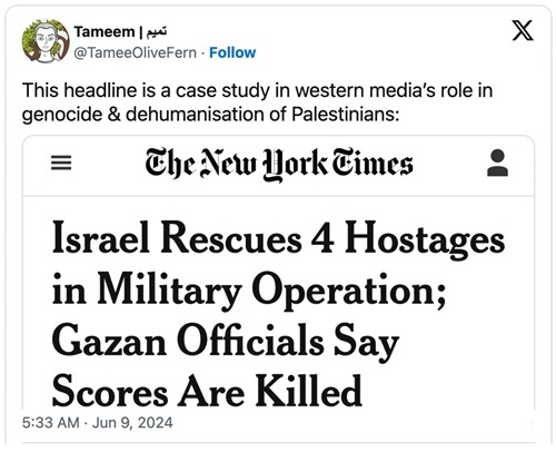 They could have just as easily written “Israel Kills Hundreds of Palestinians in Central Gaza Attack; 4 Hostages Rescued” and it would have been just as true, but then public attention would have been drawn in the opposite direction. The New York Times never, ever draws public attention in that direction; the slanting only ever goes one way.