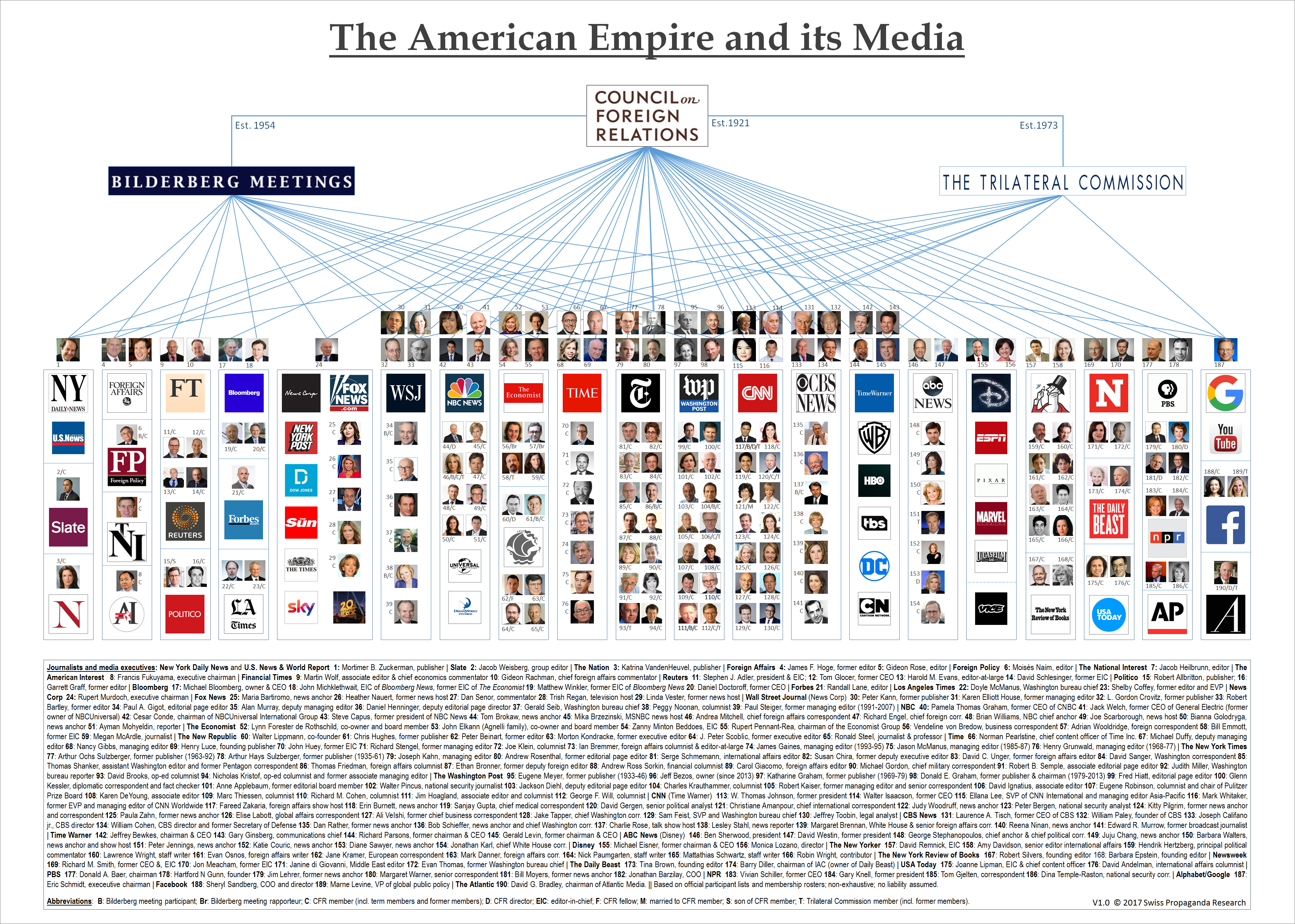 Based on official membership rosters, the following illustration depicts for the first time the extensive media network of the CFR and its two major international affiliate organizations: the Bilderberg Group (mainly covering the US and Europe) and the Trilateral Commission (covering North America, Europe and East Asia), both established by Council leaders to foster elite cooperation at the global level.